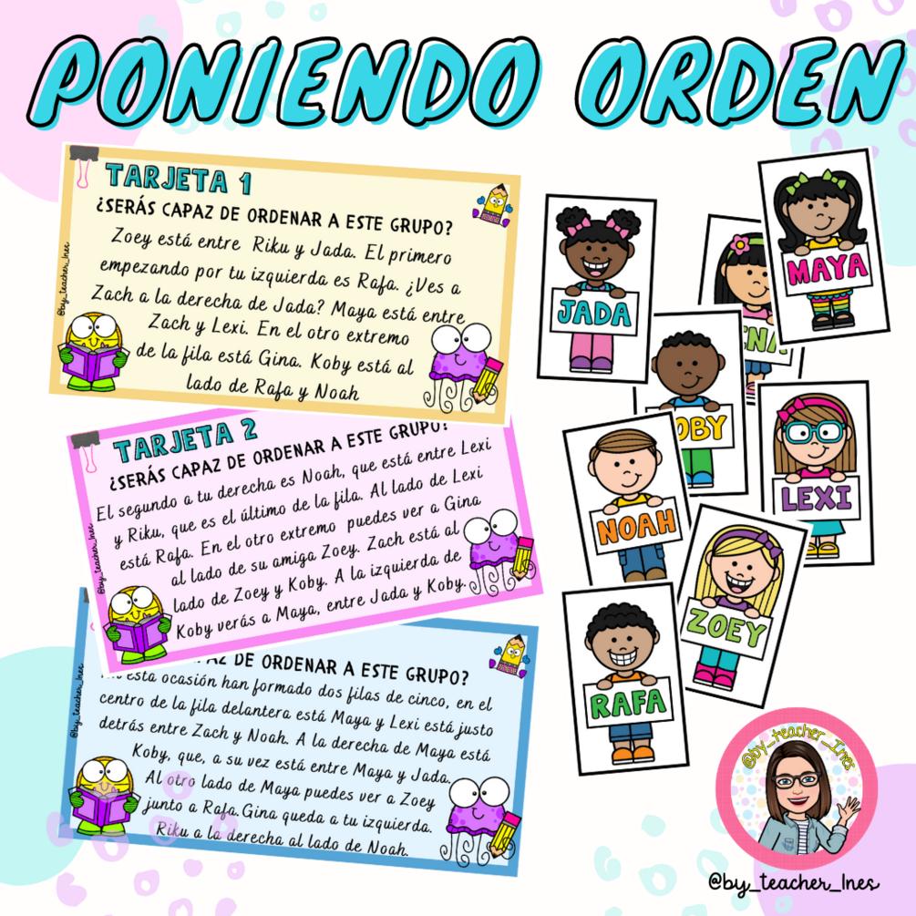 Para practicar la lectura y la comprensión lectora he preparado estas tarjetas donde nuestro alumnado tendrán que poner en orden a un grupo de niñas y niños de una clase de acuerdo a las instrucciones que lean en la tarjeta.